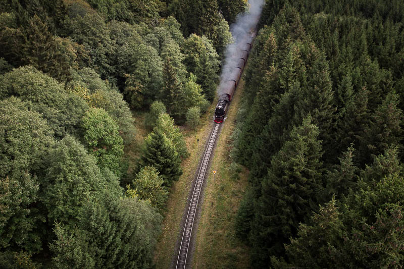So, genug erzählt. Das Schnaufen der Bahn ist unaufhörlich laut. Gleich fährt sie ins Bild. Schnell noch den passenden Bildausschnitt gewählt. Manueller Fokus (sicher ist sicher, man weiß ja wo die Bahn ins Bild fährt). Und auf die Belichtung achten! Die Lok ist schwarz und bildet einen sehr straken Kontrast. Fotografierst du im A-Modus, wird das Bild entweder zu dunkel, oder die Belichtungszeit der Kamera wird (bei niedriger ISO) möglicherweise zu lang werden. Dann ist die Brockenbahn unscharf. Das wäre schade. Den Fehler haben wir aber alle schon gemacht. Ich gehe auf Nummer sicher und fotografiere komplett im manuellen Modus. Hier das Ergebnis.