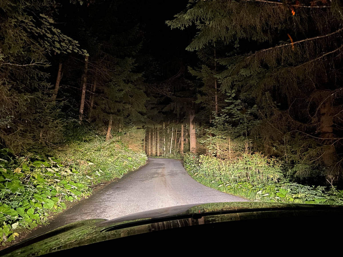Wir bleiben in Oberau. Eine kleine Straße führt von der Ortsmitte bis hinauf zur Horlerstiegl: Ein exzellenter Ausgangspunkt zum Wandern (z.B. zum Rosskopf oder dem Feldalphorn), ohne extra mit der Seilbahn zum Markbachjoch fahren zu müssen. Hier ist es besonders dunkel. Selbst mit Fernlicht sieht man den Wald vor lauter Bäumen kaum.